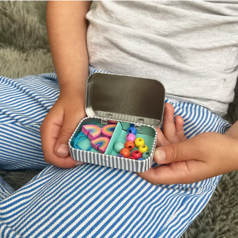 A beautiful gift tin containing elastic & beads to create this rainbow bracelet. The elastic comes with metal ends to aid the beading process for young children. The tin can be used to store the bracelet or a special trinket.